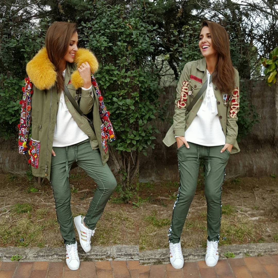 Lleva un pantalón con una banda de lentejuelas combinado con una sobrecamisa y una parka de Fetiche Suances, playeros de Adidas, bolso de Sandro y anillos y collar de Tous.